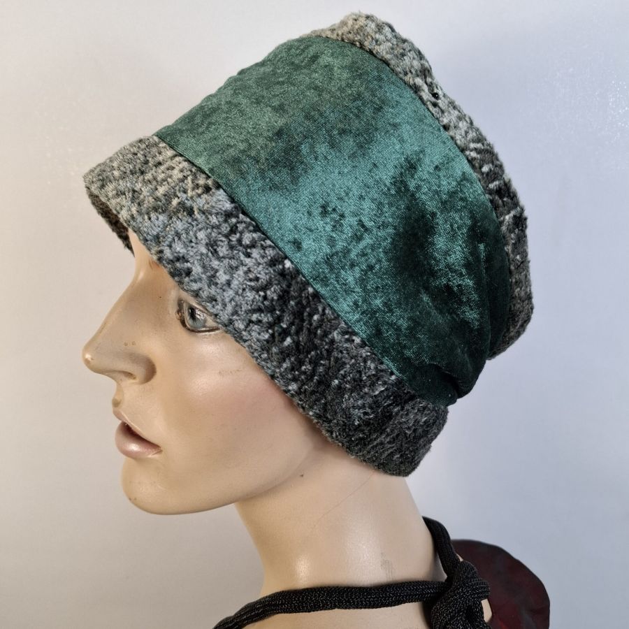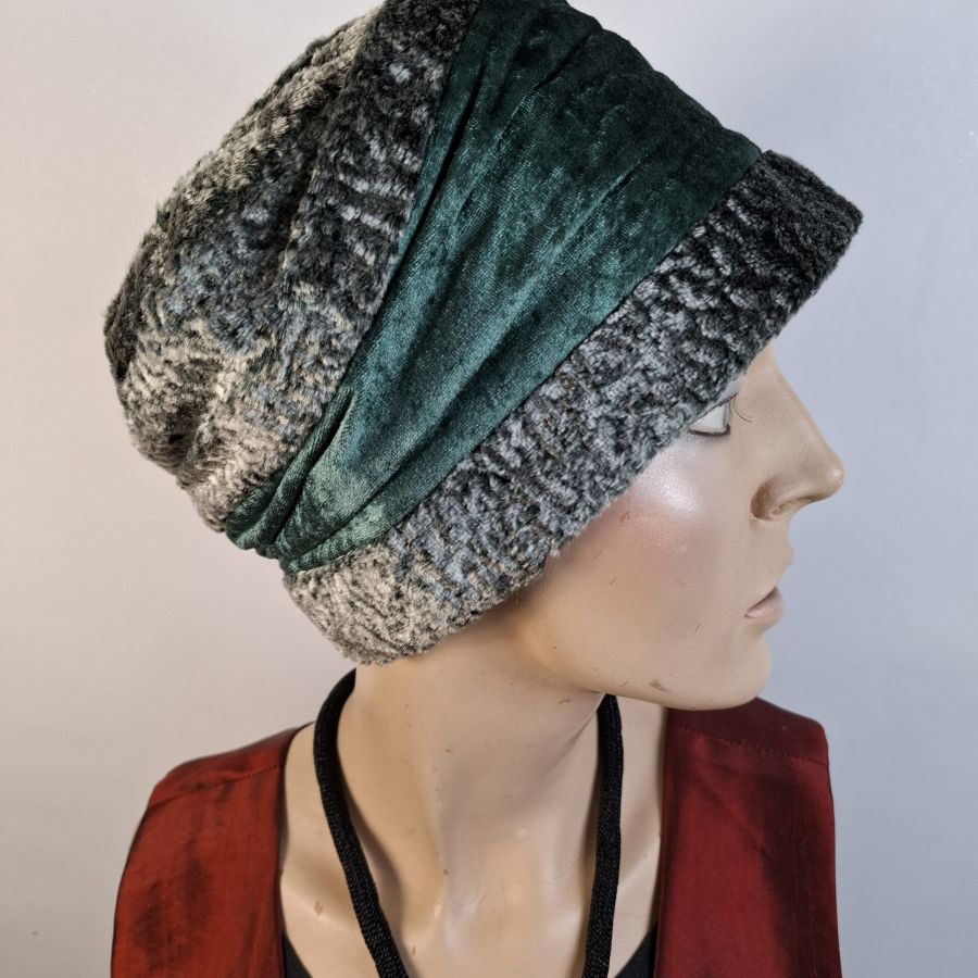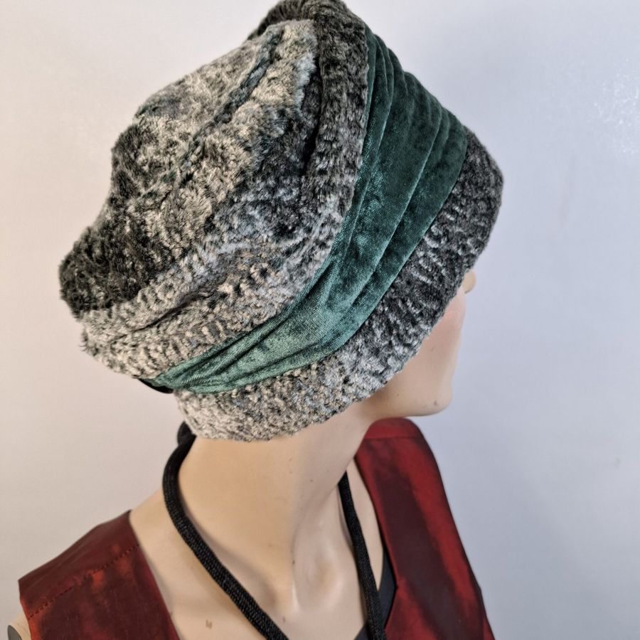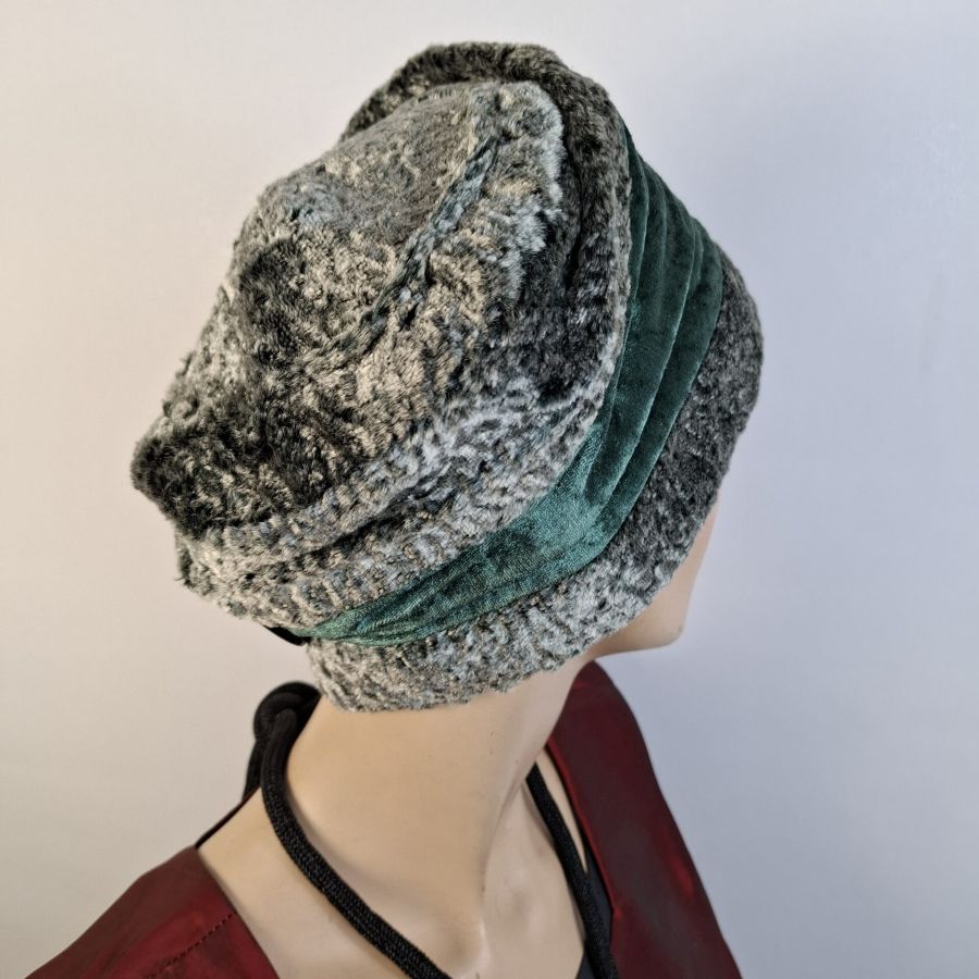 Die aus Webpelz und Samt gefertigte Damenkappe ist in den Grössen 56 – 58 tragbar.