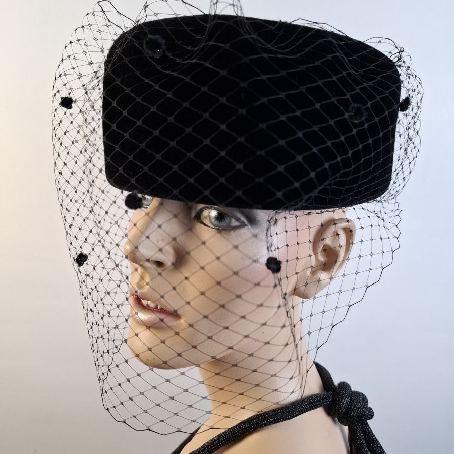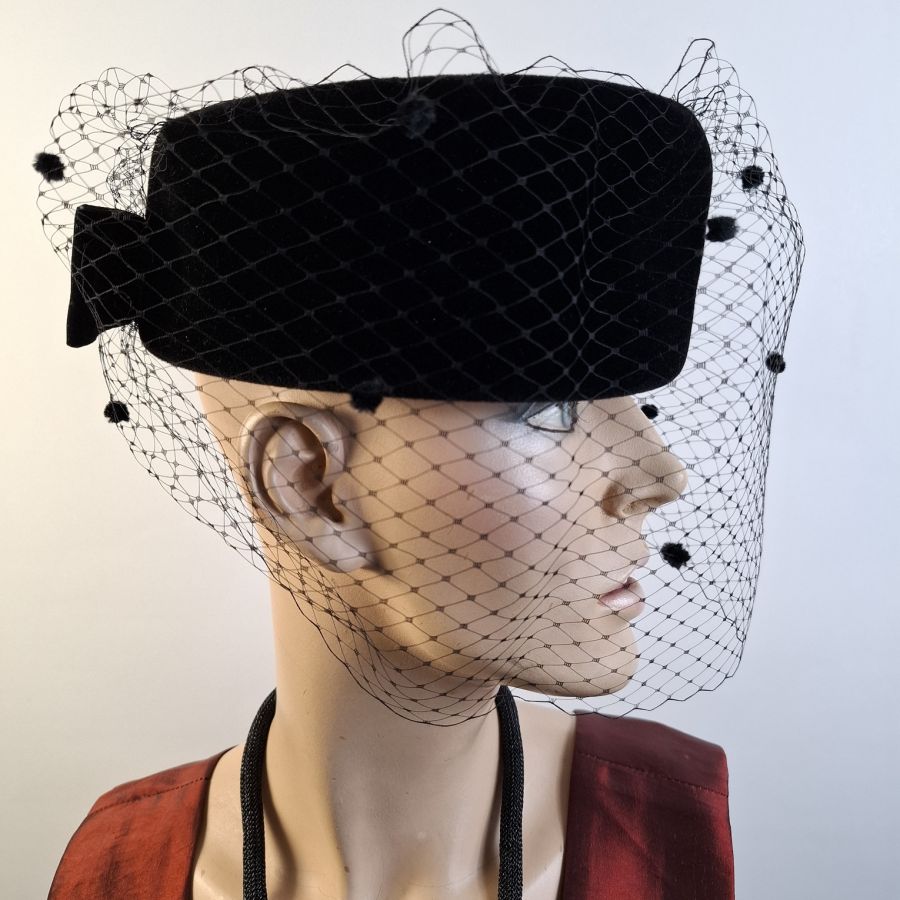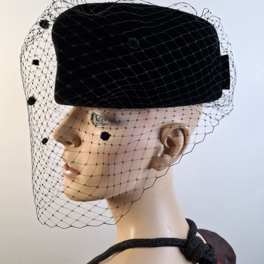 Die kleine Pillbox ist aus schwarzem Samt gearbeitet und mit einem Tupfenschleier versehen, der in verschiedenen Längen zu tragen ist. Es handelt sich um eine Uni Größe.