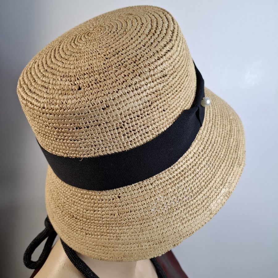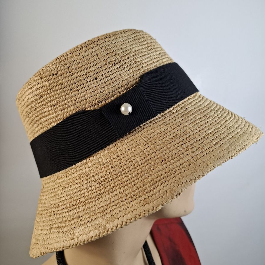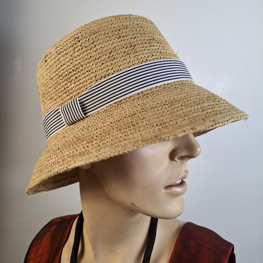 Der aus 100% Naturstroh gefertigte Bucket Hat ist besonders stabil durch seine Flechtung und ist eignet sich gut für Reisen, da er auch in den Koffer gepackt werden kann.