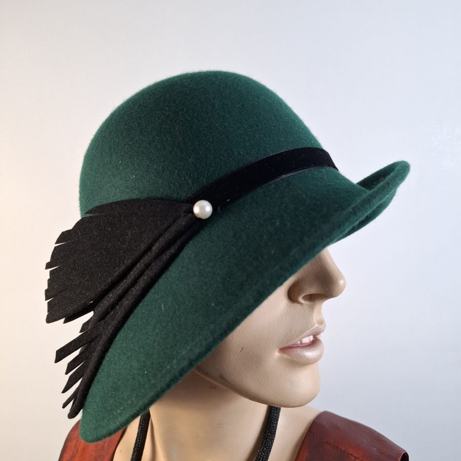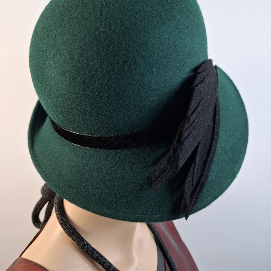 Die asymmetrisch geschnittene 20er Jahre Glocke ist aus Wollfilz gearbeitet und auf Nachfrage in weiteren Farben erhältlich. Sie ist in den Größen 55 – 58 tragbar.