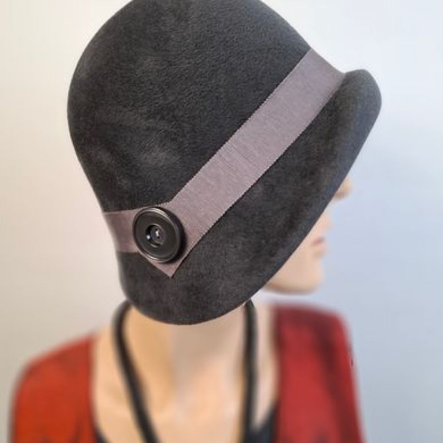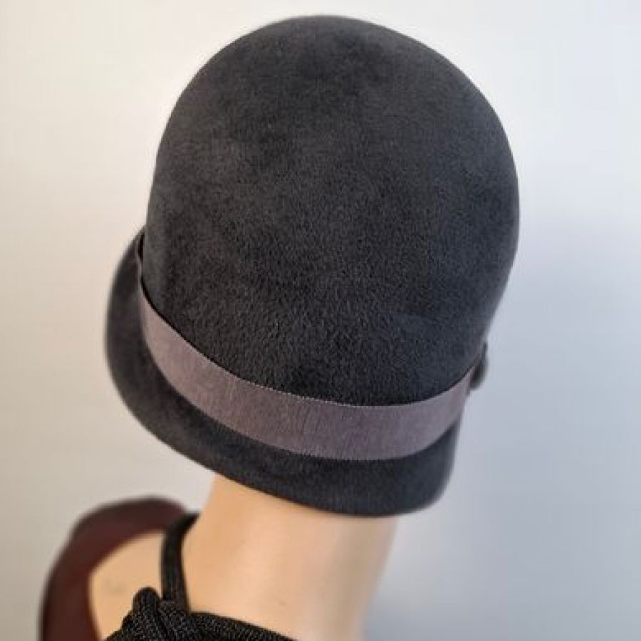 Die 20er Jahre Glocke aus Wollfilz ist gut zu sportlich eleganter Kleidung zu kombinieren und in den Größen 56 – 58 zu erhalten.