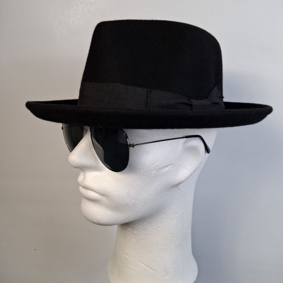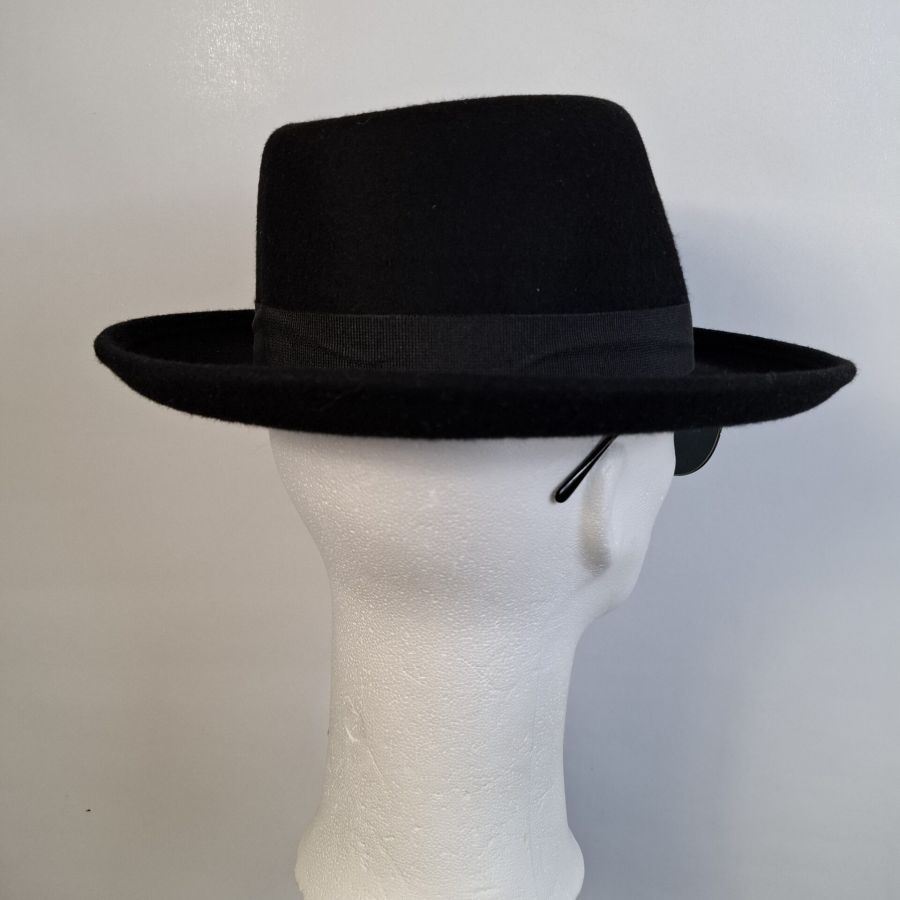Der schwarze Herrenhut ist aus Wollfilz und ein echter Klassiker, er ist in den Größen 55 – 61 erhätlich